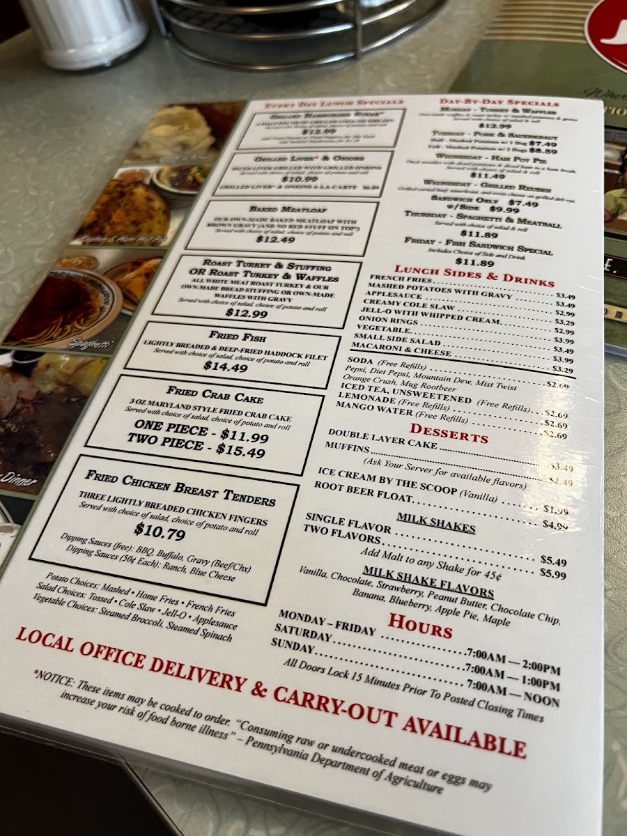 The menu features comforting classics designed to satisfy every palate. Daily lunch specials include the mouthwatering Grilled Hamburger Steak and the hearty Baked Meatloaf, both served with your choice of salad, potato, and a roll. On Mondays, indulge in Turkey & Waffles, while Tuesdays call for delicious Pork & Sauerkraut to experience the best of homestyle cooking.